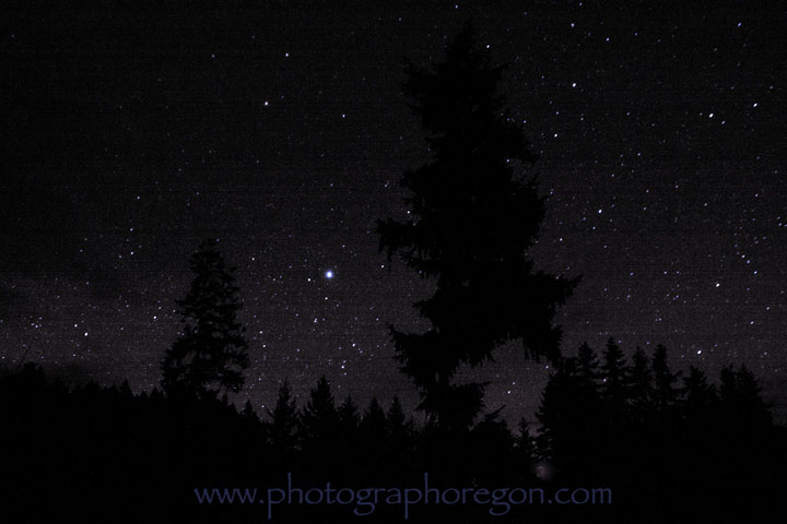 When we did this night star photography at Tumalo Falls we never saw the moon, which makes it a little more difficult, because for starry night shots you usually have to use your manual focus and the moon is a nice tool to have to set your focus by. So, in this case we had to spotlight a tree in the distance to set the focus.