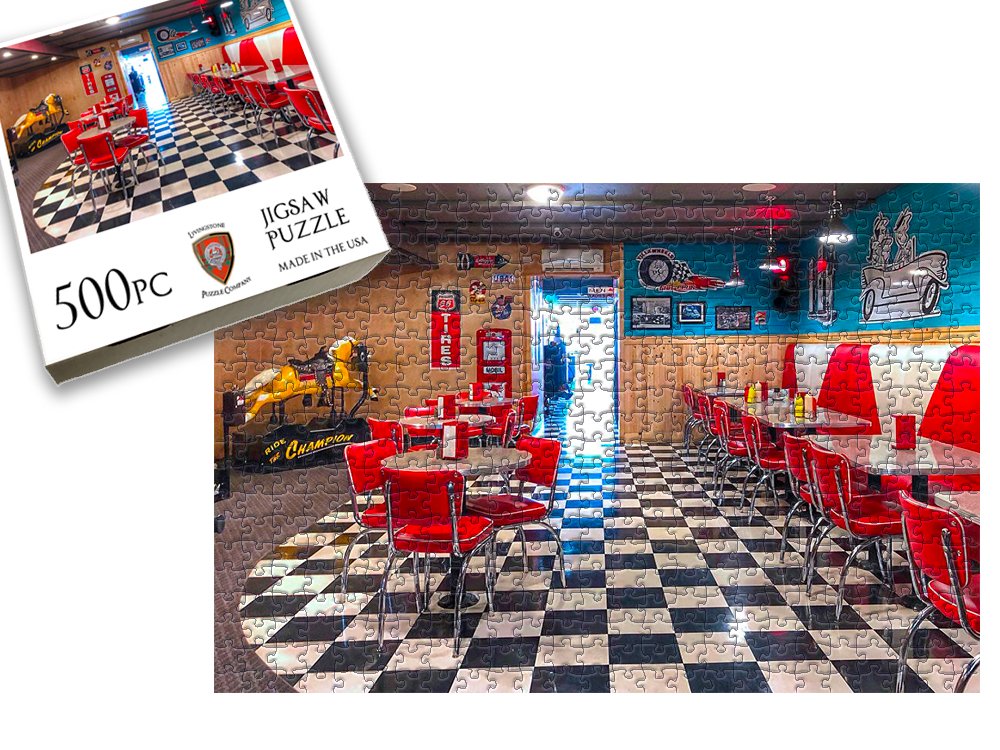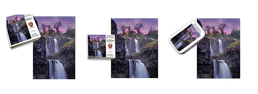 Our puzzles come in three sizes. 500pc 12x18", 100pc 11x14" large piece puzzles, (Great for people with eyesore or dexterity issues.) and 150pc 5x7" Tiny Tin travel puzzles.