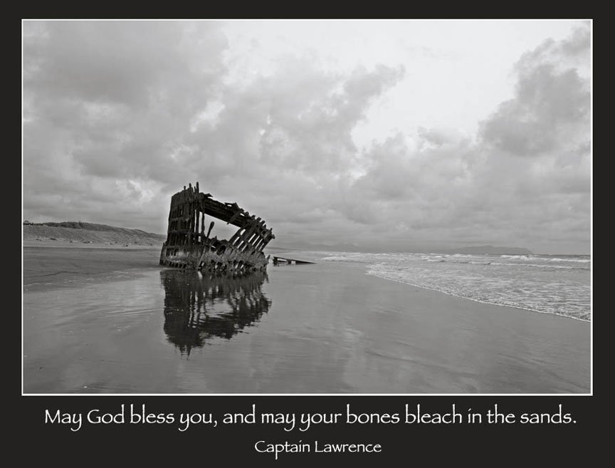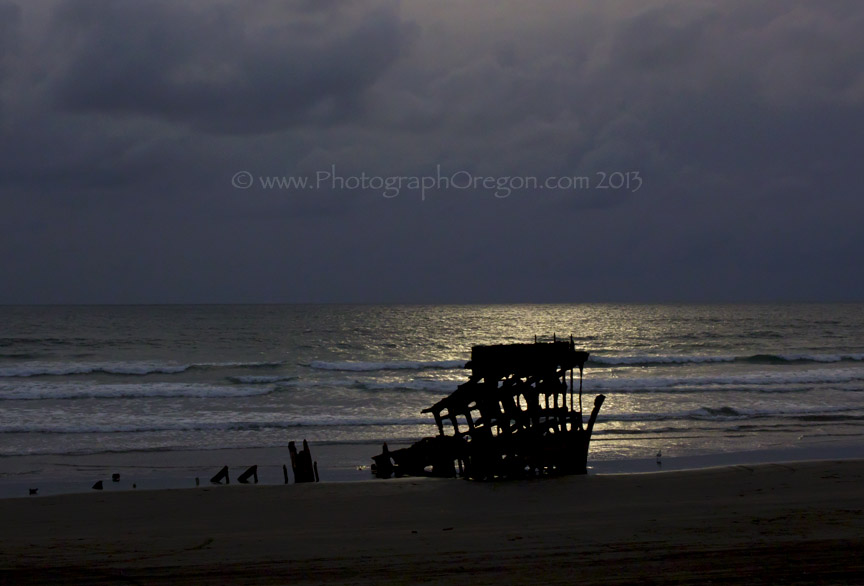 She was a four-masted steel barque sailing ship that ran aground on October 25, 1906, on the Oregon coast on her way to the Columbia River. The ship was abandoned on Clatsop Spit near Fort Stevens in Warrenton about four miles south of the Columbia River channel. The wreckage lies there on the beach, making it a popular tourist attraction, and of course prime shipwreck photographic icon.