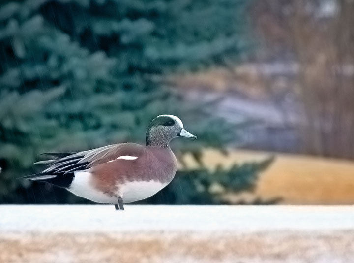 American Wigeon Male (drake) duck (Anas americana) . There have been sightings of Eurasian Wigeons (Anas penelope) too, but I have not gotten a good photo of them yet! There are several pairs of American Wigeons in Drake Park (downtown Bend, Or)