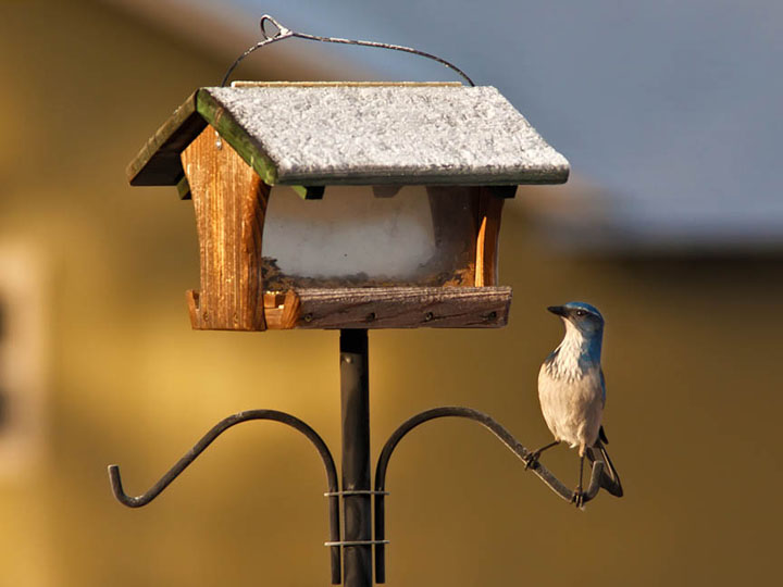 Western scrub jays (Aphelocoma californica) are pretty common here and very obnoxious. I love them. True to their name then live in the mountain scrubs and at my feeder.