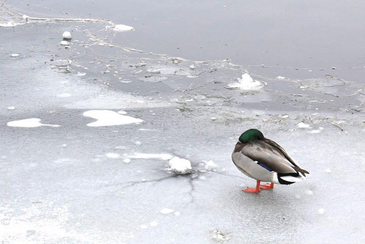 We have some hardy little Mallard ducks (Anas platyrhynchos) here in Oregon. they hang around all year long, sun or snow.